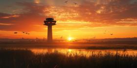Tall Tower Silhouette Against a Vibrant Sunset over Water, Calm Horizon Landscape