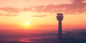 Tall Tower Silhouette Against a Vibrant Sunset over Water, Calm Horizon Landscape