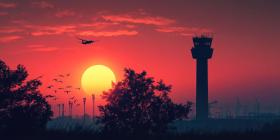 Tall Tower Silhouette Against a Vibrant Sunset over Water, Calm Horizon Landscape