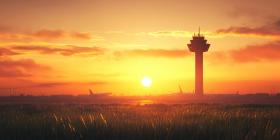 Tall Tower Silhouette Against a Vibrant Sunset over Water, Calm Horizon Landscape