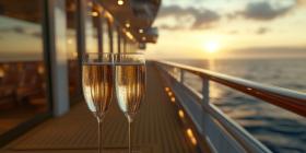 Three Champagne Flutes on a Yacht Deck at Sunset with Ocean View