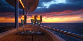 Three Champagne Flutes on a Yacht Deck at Sunset with Ocean View