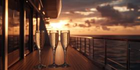 Three Champagne Flutes on a Yacht Deck at Sunset with Ocean View