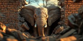 Elephant Emerging from a Broken Brick Wall, Symbolic Strength and Breakthrough Concept