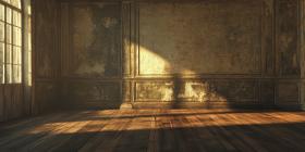 Empty Industrial Room with Sunlight Streaming Through Windows, Rustic Wooden Floor and Distressed Walls