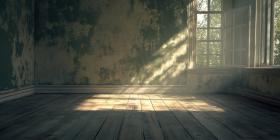 Empty Industrial Room with Sunlight Streaming Through Windows, Rustic Wooden Floor and Distressed Walls