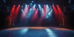 Empty Stage with Purple Lights and Smoke in a Dark, Industrial Venue