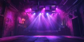 Empty Stage with Purple Lights and Smoke in a Dark, Industrial Venue