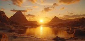 Golden Sunset Over Water Between Rocky Mountains, Dramatic Landscape with Clouds and Reflections