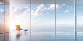 Modern Office Interior with Floor-to-Ceiling Windows Overlooking a Cityscape at Sunset