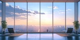 Modern Office Interior with Floor-to-Ceiling Windows Overlooking a Cityscape at Sunset