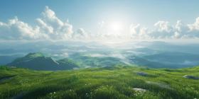 Lush Green Mountain Landscape with Rolling Hills, Mist, and Bright Sunlight, Peaceful Nature Scene