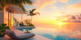 Tropical Beach Sunset with Palm Trees, Flowers, and Golden Light Reflecting on the Water