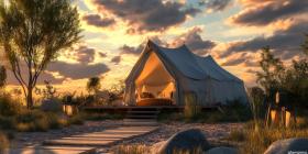 Glamping Bell Tent at Sunrise with Outdoor Seating, Fire Pit, and Scenic Nature View