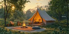 Glamping Bell Tent at Sunrise with Outdoor Seating, Fire Pit, and Scenic Nature View