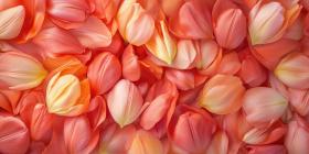 Scattered Tulip Petals in Shades of Red, Orange, and Cream on a White Background, Flat Lay Floral Arrangement