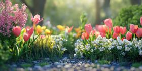 Sunlit Garden with Blooming Tulips and Wildflowers, Peaceful Spring Scene
