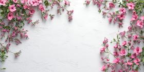 Pink Flowers and Delicate Green Sprigs Frame a Textured White Background