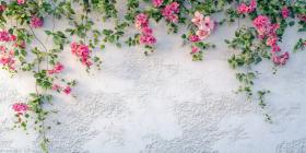 Pink Flowers and Delicate Green Sprigs Frame a Textured White Background