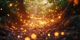 Enchanted Forest Path Illuminated by Rainbow Lights, Magical Nighttime Scene