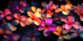 Luminous Frangipani Flowers in a Spectrum of Glowing Hues Against a Dark Background