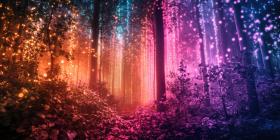 Enchanted Forest Path Illuminated by Rainbow Lights, Magical Nighttime Scene