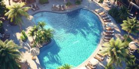 Heart-Shaped Swimming Pool Surrounded by Palm Trees and Lounge Chairs, Tropical Resort View