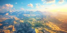 Mountainous Landscape Bathed in Golden Light with Blue Sky and Clouds, Aerial Perspective