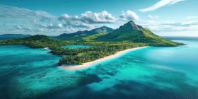 Tropical River with Boats, Lush Vegetation, and Pink Flowers, Aerial View of a Paradise Setting
