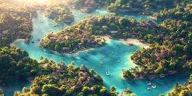 Tropical River with Boats, Lush Vegetation, and Pink Flowers, Aerial View of a Paradise Setting
