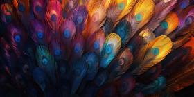 Rainbow Feathers Close-Up, Vibrant Plumage, Detailed Texture, Colorful Bird Wings, Macro Photography, Nature's Palette, Artistic Feathers, Feathered Beauty