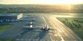 Airplane Taking Off from Airport Runway at Sunrise, Busy Airport Scene with Cityscape in Background