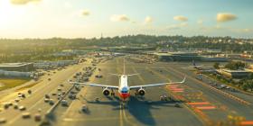 Airplane Taking Off from Airport Runway at Sunrise, Busy Airport Scene with Cityscape in Background