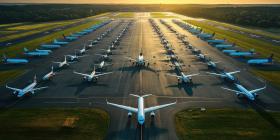 Airplane Taking Off from Airport Runway at Sunrise, Busy Airport Scene with Cityscape in Background