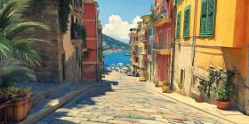Cobblestone Street Lined with Buildings and Greenery in a Sunny Mediterranean Town