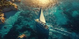 Sailing Yacht in Turquoise Waters Near Rocky Coastline, Aerial View at Sunset