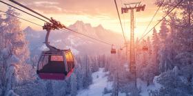 Ski Resort with Cable Cars Ascending Snowy Mountains, Winter Wonderland Landscape
