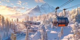 Ski Resort with Cable Cars Ascending Snowy Mountains, Winter Wonderland Landscape