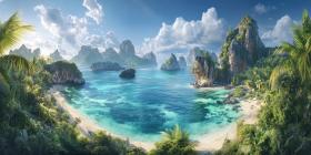 Secluded Tropical Cove with Turquoise Waters, White Sand Beach, and Lush Green Cliffs