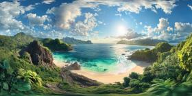 Secluded Tropical Cove with Turquoise Waters, White Sand Beach, and Lush Green Cliffs