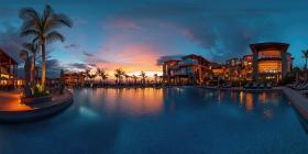 Luxurious Resort with Long Swimming Pool, Palm Trees, and Classical Architecture at Golden Hour