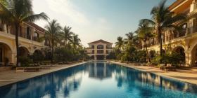 Luxurious Resort with Long Swimming Pool, Palm Trees, and Classical Architecture at Golden Hour