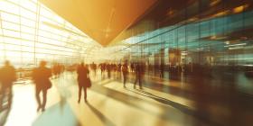 Busy Airport Terminal Bustling with Travelers and Sunlit Tarmac View Through Glass Windows