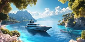 Tropical Beach Paradise with Turquoise Waters, Palm Trees, and Rocky Cliffs, Sunny Day Scene