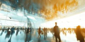 Busy Airport Terminal Bustling with Travelers and Sunlit Tarmac View Through Glass Windows