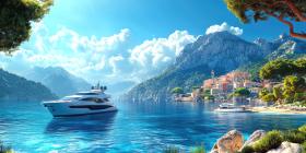Luxury Yacht Anchored in a Bay with a Coastal Town and Mountain Backdrop, Sunny Mediterranean Scene
