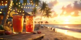 Tropical Cocktails at Sunset on a Beach with Palm Trees and Lush Vegetation
