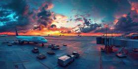 Airplane Parked at Gate with Ground Crew and Equipment, Airport Scene with City Skyline in Distance