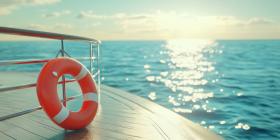 Lifebuoy on a Yacht Railing with Ocean View at Sunset