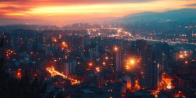 Luxury Apartment with Curved Windows Overlooking a Cityscape at Sunset, Modern Interior Design